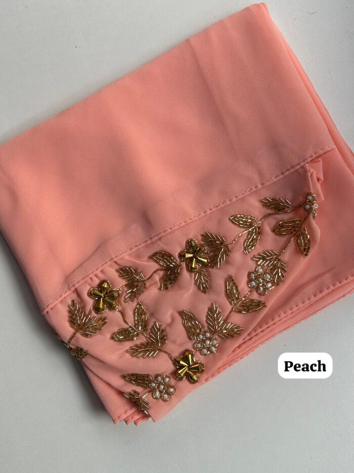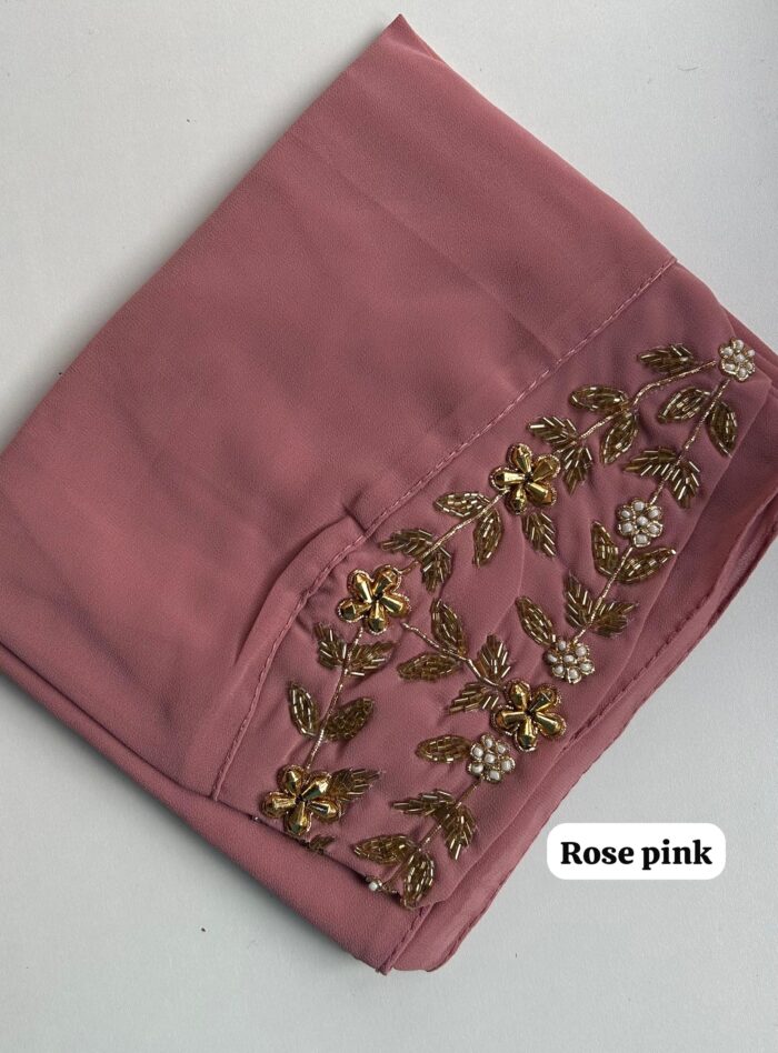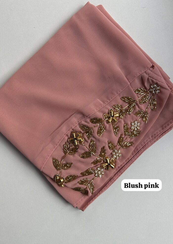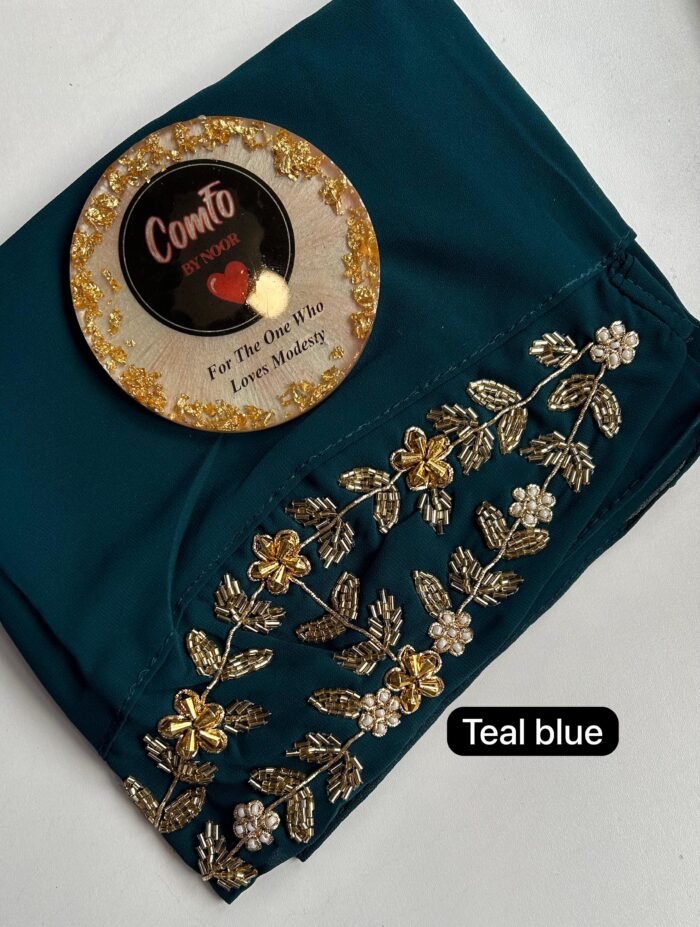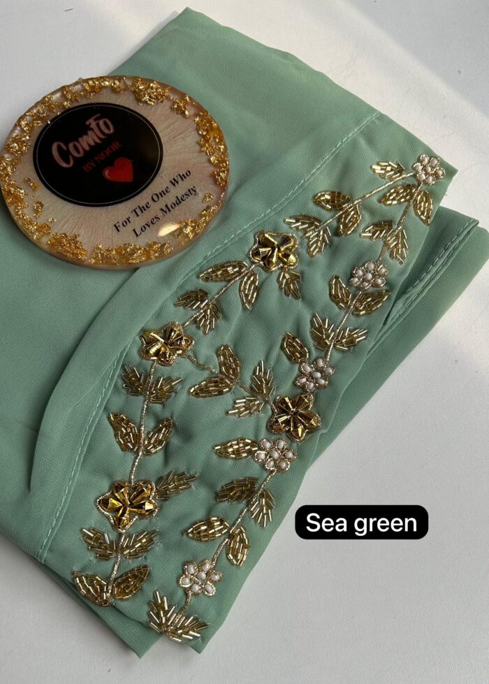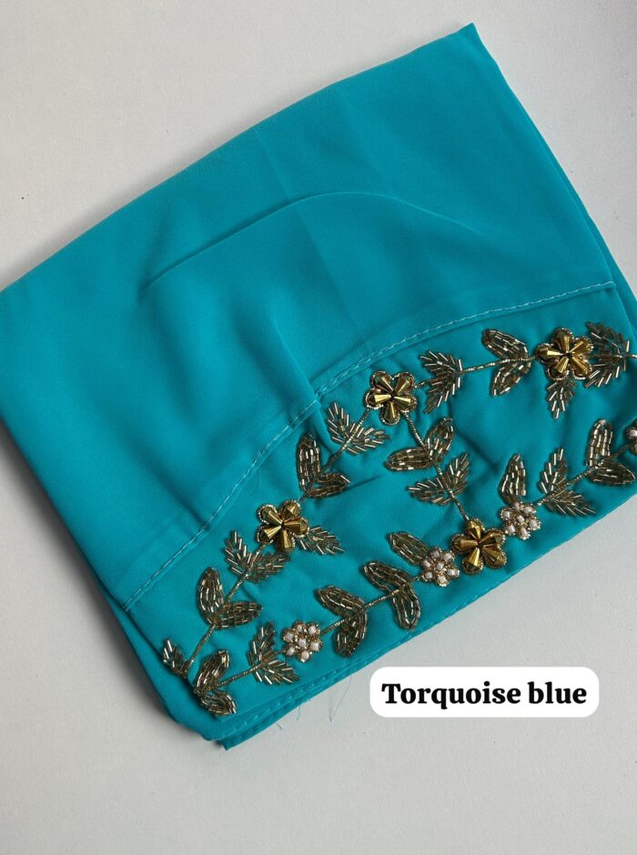 These hijabs feature a heavy front panel embroidery of 38cm (15″ approximately) that has been placed on one end of the hijab and a tie back so that you can wrap your hijab in any style. It features zardozi work that includes stones, sequins and beads.